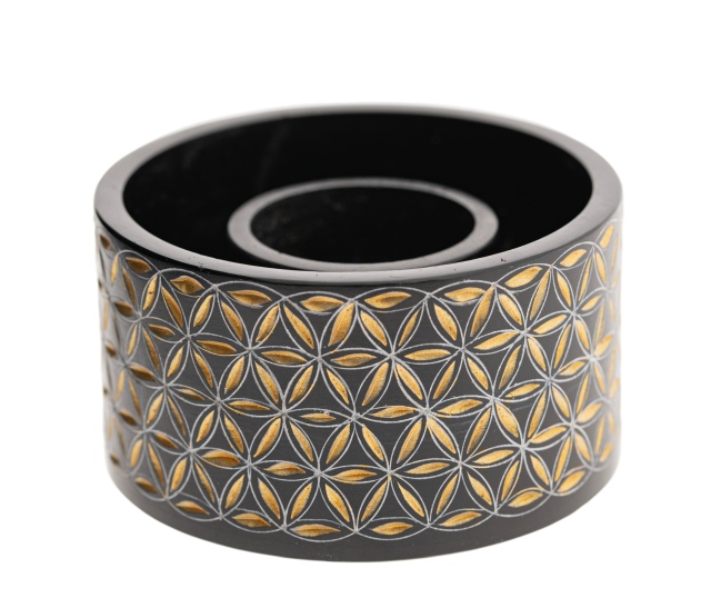 Elegante Smudge Bowl in schwarz-gold mit eingravierter Blume des Lebens. Die Blume des Lebens sorgt für eine hochenergetische und geschützte Räucherung.