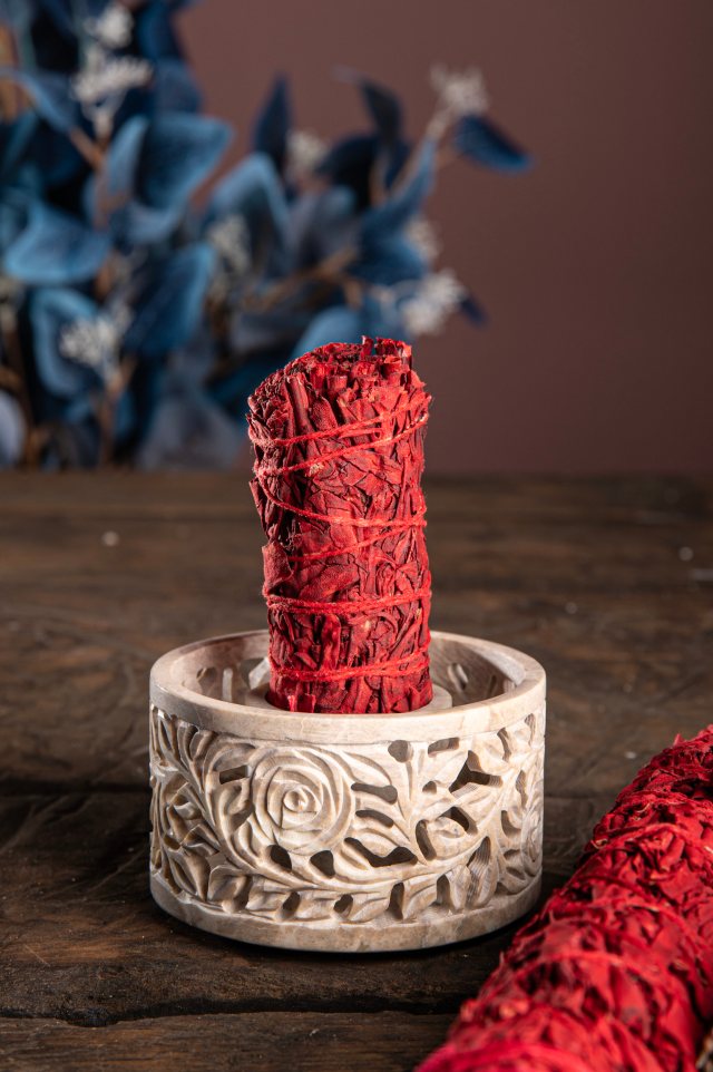 Naturspeckstein mit alter indischer Schnitzkunst. Die kunstvollen Rosenranken strahlen Reinheit und Liebe in den Räuchervorgang.