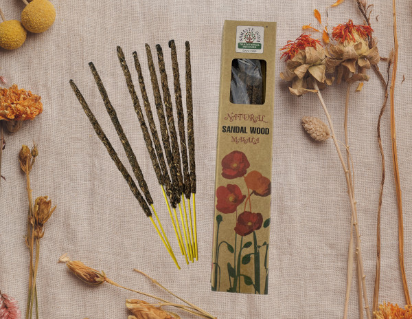 Handgerollte Räucherstäbchen die mit echten Sandelholzflocken ummantelt sind. Sie werden mit natürlichen ätherischen Ölen des Sandelholzes angereichert. Der warme und holzige Duft des südindischen Sandelholzes hat eine beruhigende und entspannende Wirkung-