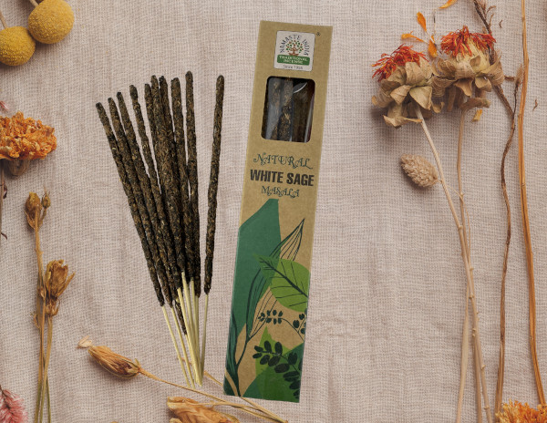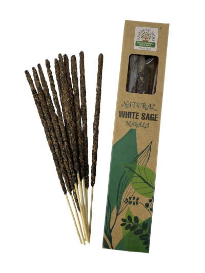 Handgerollte Räucherstäbchen die mit echten Sandelholzflocken ummantelt sind. Sie werden mit natürlichen ätherischen Ölen des Weißen Salbei angereichert. Der würzige Kräuterduft der Blätter des Strauches aus den USA und Mexiko reinigt und klärt.