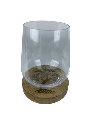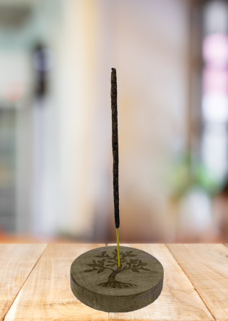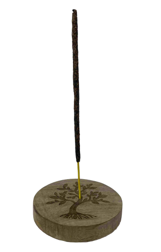 Runder Räucherstäbchenhalter aus Mangoholz. Motiv Lebensbaum. Auch als Untersetzer für Gläser geeignet. Durchmesser ca. 10 cm und Höhe etwa 1,5 cm.