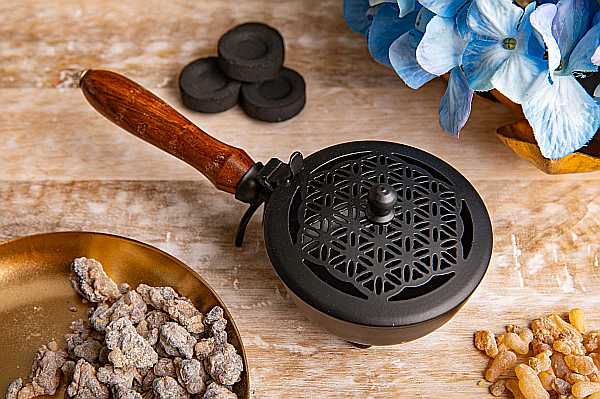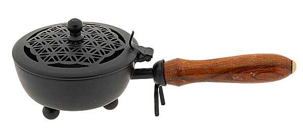 Praktische Räucherpfanne für leichtes Räuchern. Bitte mit Sand verwenden. Pulverbeschichtetes Eisen mit Holzgriff H: 7,5 cm, L: 21 cm, B: 9 cm